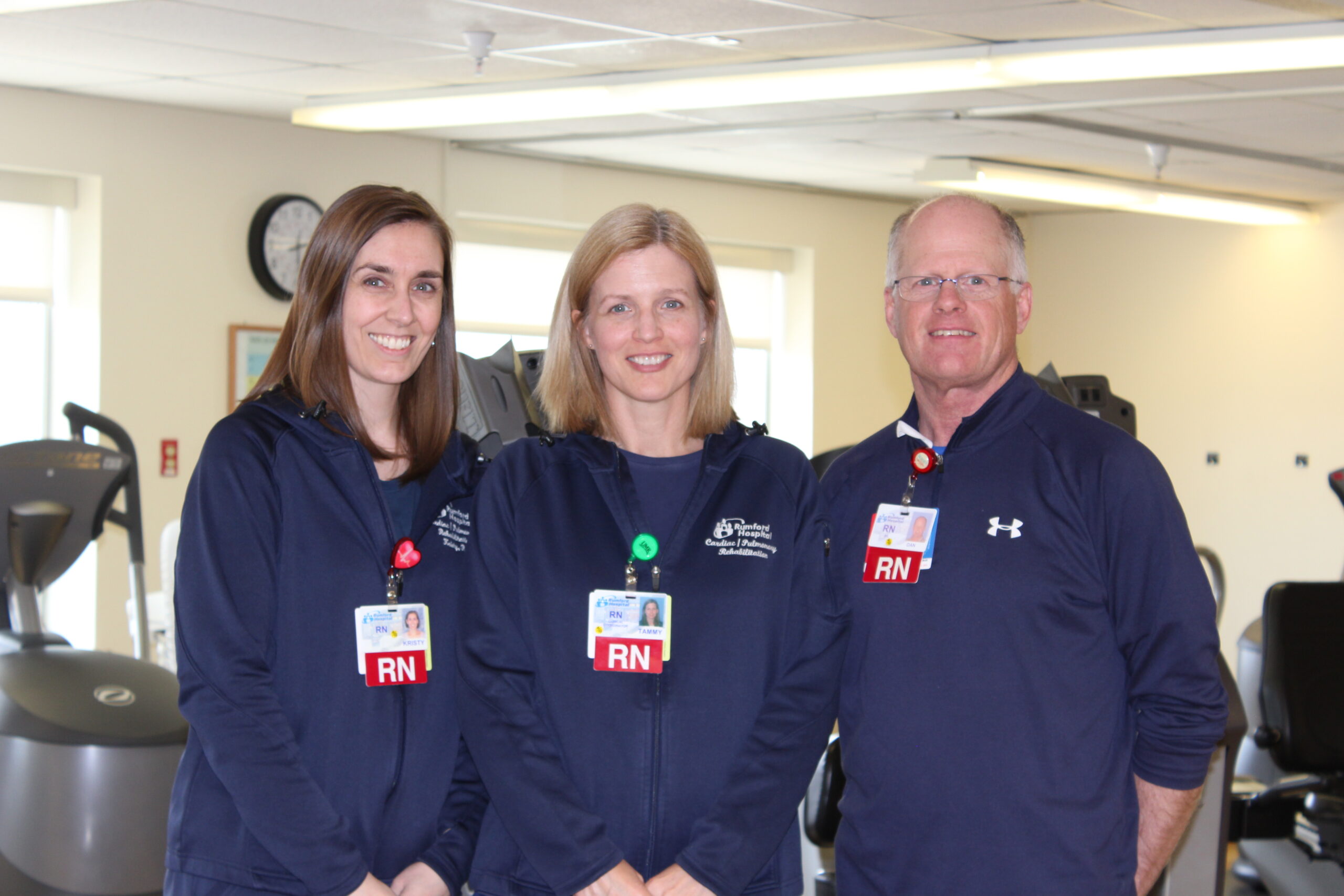 Pictured: members of the Rumford Hospital cardiac rehab unit, Krysty Tomkins, RN, Tammy Berry, RN, Dan Elliot, RN